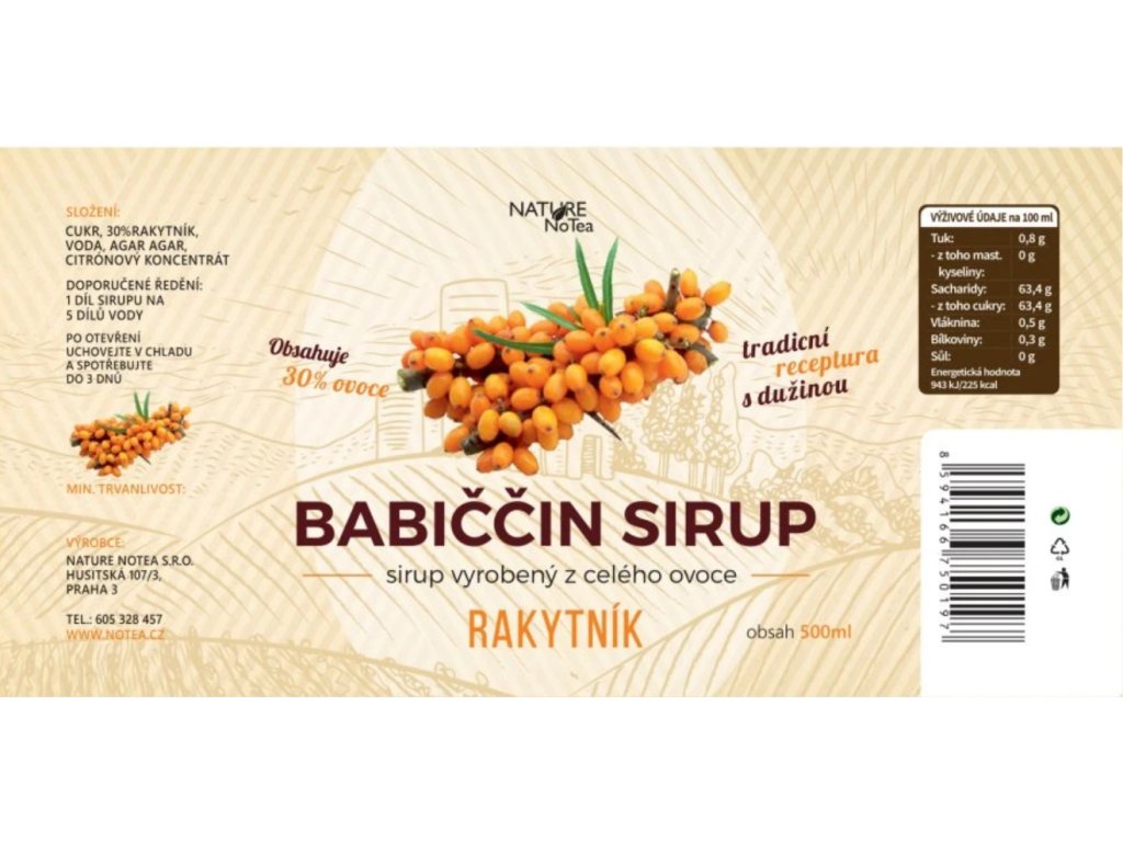 Rakytník je právem nazýván "zlatem severu" díky vysokému obsahu vitaminu C a dalších cenných látek. Babiččin sirup z rakytníku je vyroben podle tradiční receptury, bez použití umělých barviv, sladidel a konzervantů. Výrazná, mírně nakyslá chuť skvěle osvěží i posílí organismus.