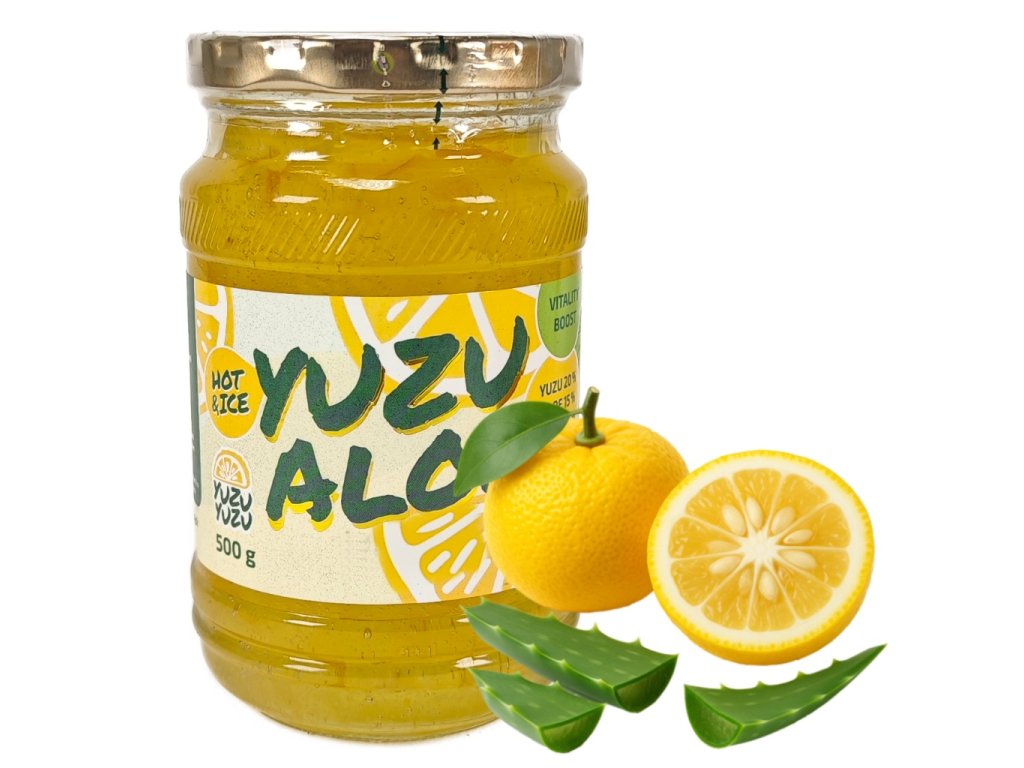 Citrusové plody Yuzu 20%, aloe vera gel 15%. Med 5%, voda, cukr, kyselina citronová (regulátor kyselosti), karboxymethylcelulóza (zahušťovadlo)
